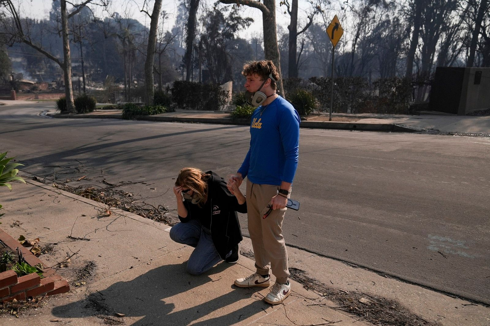 Kathleen Orlinksy prays while holding hands with her son David after finding out their home was spared in the aftermath of the Palisades Fire in the Pacific Palisades neighborhood of Los Angeles, Thursday, Jan. 9, 2025. (AP Photo/Jae C. Hong)