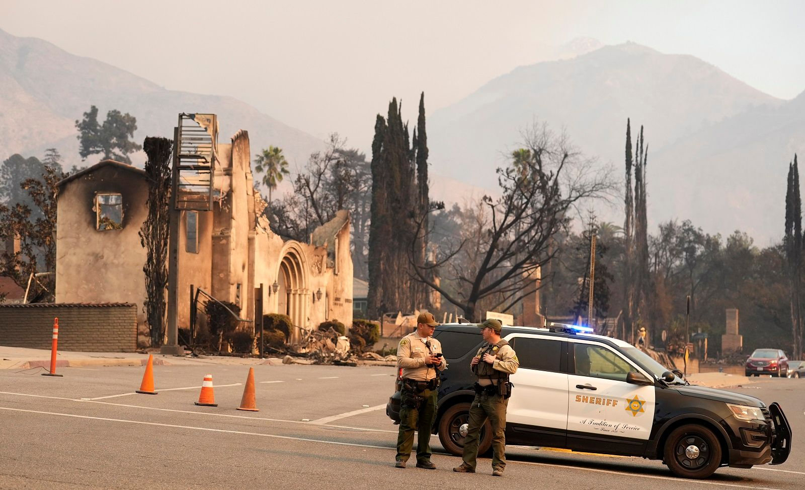 Los Angeles County Sheriff's deputies stand near the destroyed Altadena Community Church, Thursday, Jan. 9, 2025, in Altadena, Calif. (AP Photo/Chris Pizzello)