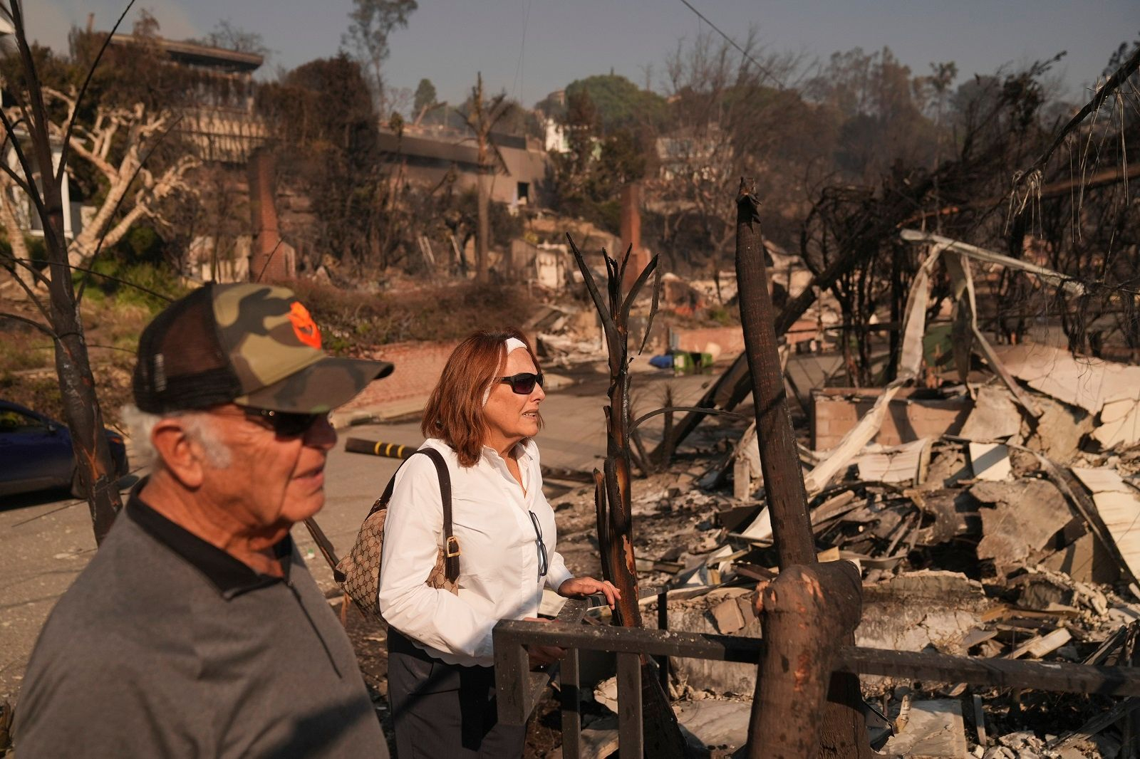 Ali Habibi and his wife Shabnam visit their fire-ravaged home in the aftermath of the Palisades Fire in the Pacific Palisades neighborhood of Los Angeles, Thursday, Jan. 9, 2025. (AP Photo/Jae C. Hong)