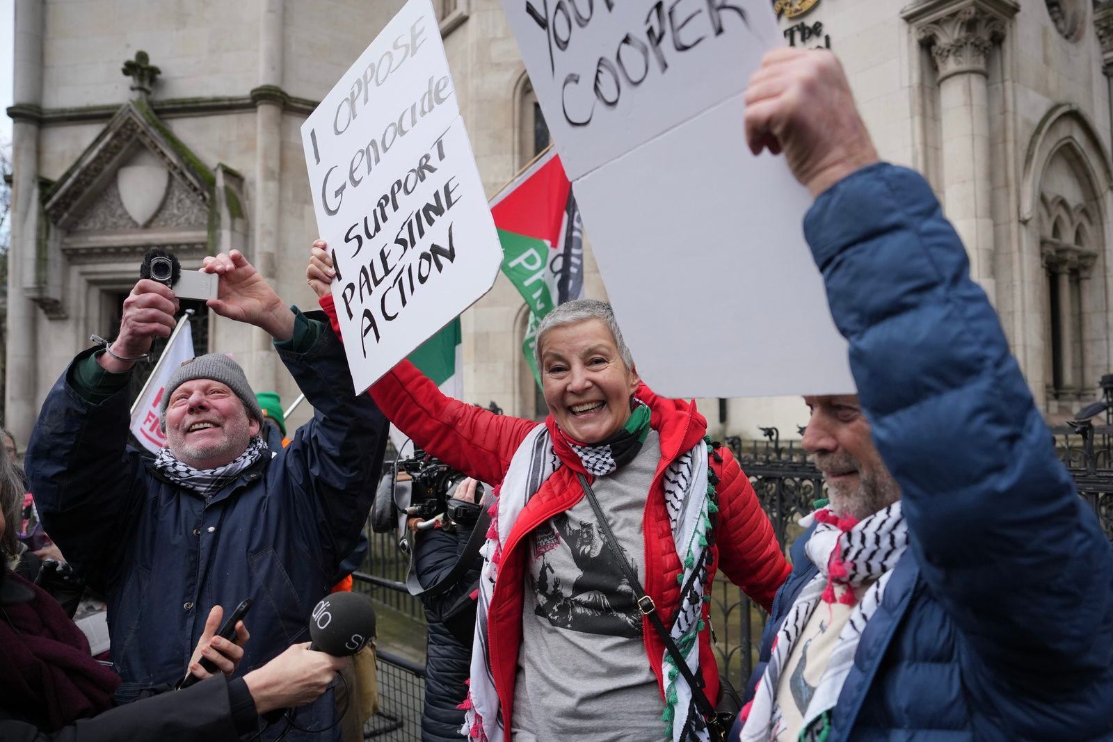 Περίπου 100 άτομα που είχαν συγκεντρωθεί έξω από το κτίριο του Ανώτατου Δικαστηρίου στο κεντρικό Λονδίνο ξέσπασαν σε επευφημίες και φώναζαν «ελευθερία στην Παλαιστίνη» όταν άκουσαν την απόφαση.