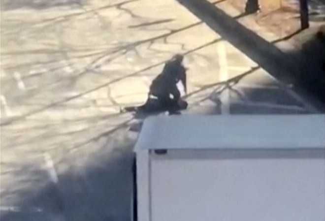Την ίδια ώρα, βίντεο δείχνει το δράστη της επίθεσης αφού έχει διαπράξει την επίθεση και τρέχει στο δρόμο πριν συλληφθεί από τις αρχές.