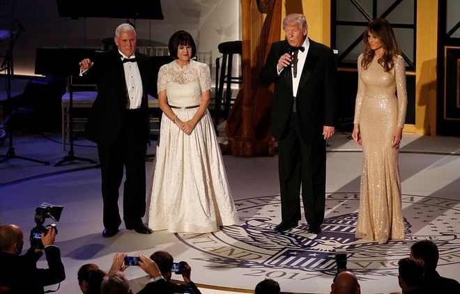 Η Μελάνια Τραμπ φορούσε ένα εντυπωσιακό χρυσαφί φόρεμα. Στο δείπνο ήταν όλο το επιτελείο του Τραμπ και όσοι τον στήριξαν στην προεκλογική του καμπάνια.