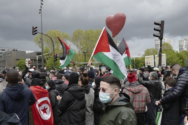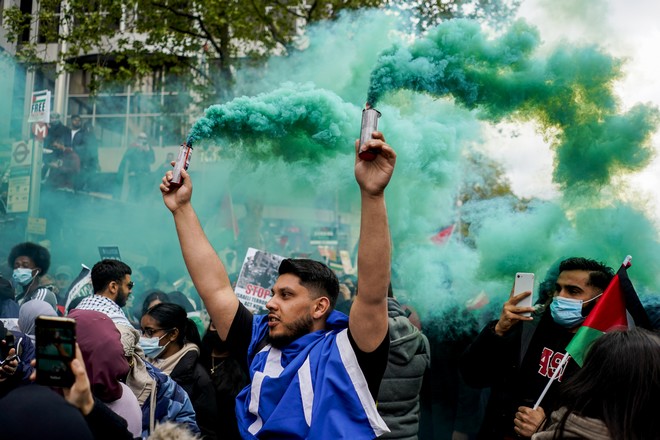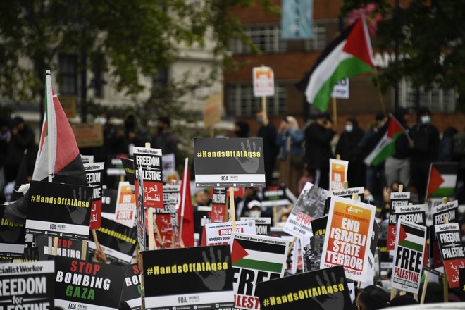 “Η Παλαιστίνη θα ζήσει. Η Παλαιστίνη θα νικήσει”, φώναζαν οι διαδηλωτές οι οποίοι κρατούσαν ή φορούσαν παλαιστινιακές σημαίες, ενώ μια ομάδα περίπου 100 ατόμων φώναζε “Ισραήλ δολοφόνε”.