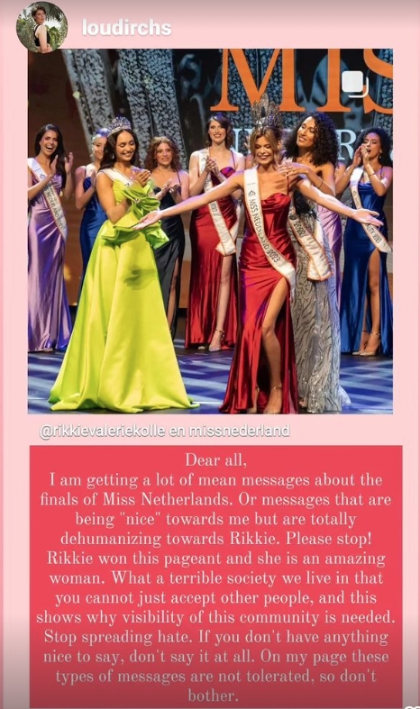 Προς υποστήριξη της νικήτριας, η Lou Dirchs που κέρδισε το βραβείο της Miss Social Media, πήρε θέση αναφέροντας πως η νίκη της Rikkie αποδεικνύει πως χρειάζεται περισσότερη ορατότητα στην κοινωνία μας. “Αν δεν έχετε κάτι καλό να πείτε, μην πείτε τίποτα καλύτερα”, πρόσθεσε.