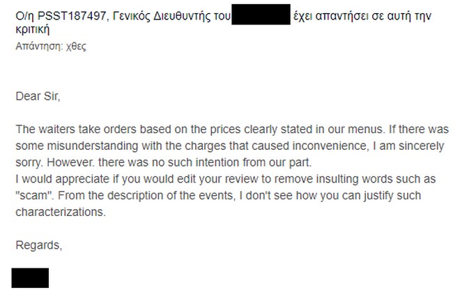 «Αγαπητέ κύριε, οι σερβιτόροι λαμβάνουν παραγγελίες με βάση τις τιμές που αναφέρονται ξεκάθαρα στο μενού μας. Αν υπήρχε κάποια παρανόηση σχετικά με τις τιμές που σας έφερε σε δύσκολη θέση, ζητώ ειλικρινά συγγνώμη. Ωστόσο. δεν υπήρχε τέτοια πρόθεση από τη δική μας πλευρά. Θα εκτιμούσα αν διορθώνατε την κριτική σας και αφαιρούσατε προσβλητικούς χαρακτηρισμούς όπως “απάτη”. Από την περιγραφή των γεγονότων, δεν βλέπω πώς μπορείτε να δικαιολογήσετε τέτοιους χαρακτηρισμούς. Σας ευχαριστώ.»