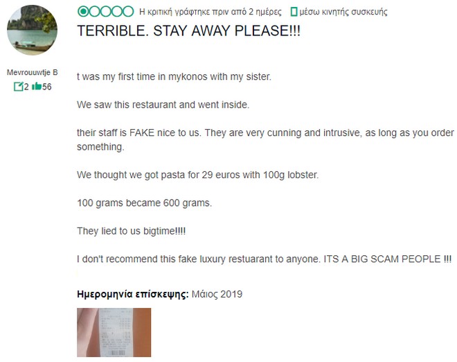 Αξίζει να σημειωθεί ότι στην ίδια ιστοσελίδα υπάρχουν παρόμοια σχόλια για το ίδιο μαγαζί και από άλλους δυσαρεστημένους τουρίστες: Ο χρήστης Mevrouuwtje B έγραψε στην κριτική του: «Ήταν η πρώτη μου επίσκεψη στη Μύκονο μαζί με την αδερφή μου. Είδαμε αυτό το εστιατόριο και μπήκαμε μέσα. Το προσωπικό τους ήταν προσποιητά ευγενικό μαζί μας. Είναι πολύ πονηροί και ενοχλητικοί μέχρι να παραγγείλεις κάτι. Νομίσαμε ότι παραγγείλαμε μακαρονάδα αξίας 29 ευρώ με αστακό 100 γραμμαρίων. Τα 100 γραμμάρια έγιναν 600 γραμμάρια. Μας είπαν ψέματα! Δεν συνιστώ σε κανέναν αυτό το ψευτοπολυτελές εστιατόριο. ΕΙΝΑΙ ΜΙΑ ΜΕΓΑΛΗ ΑΠΑΤΗ!!!»