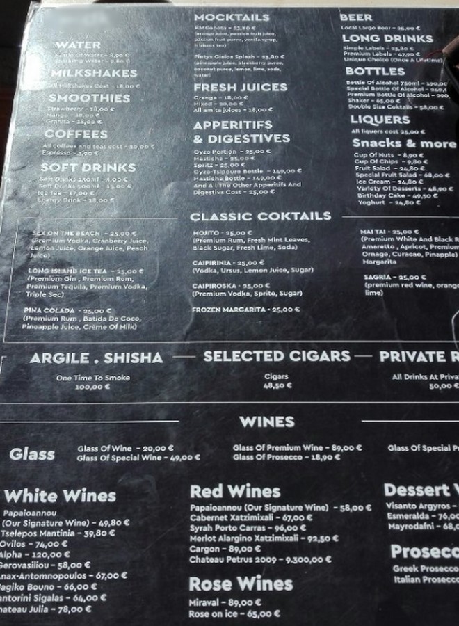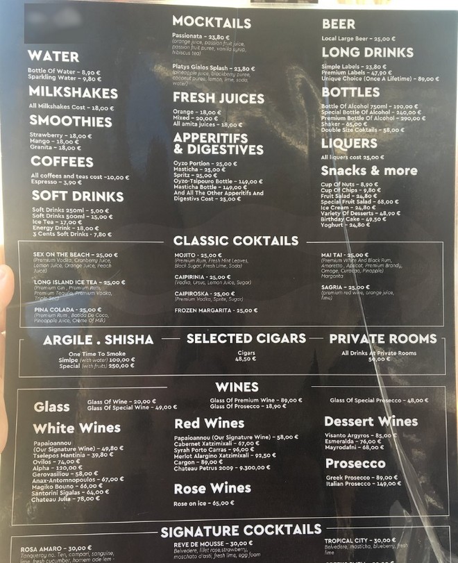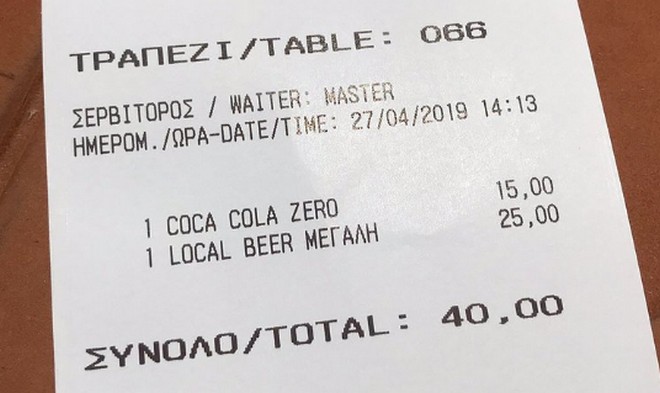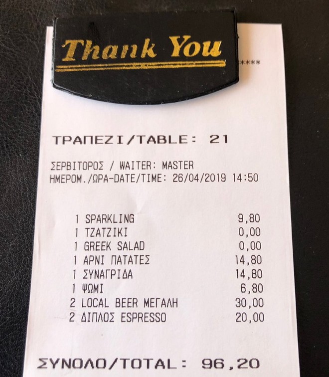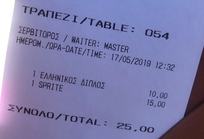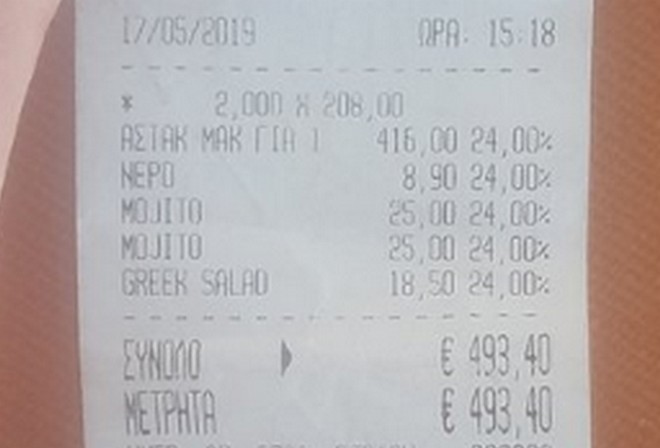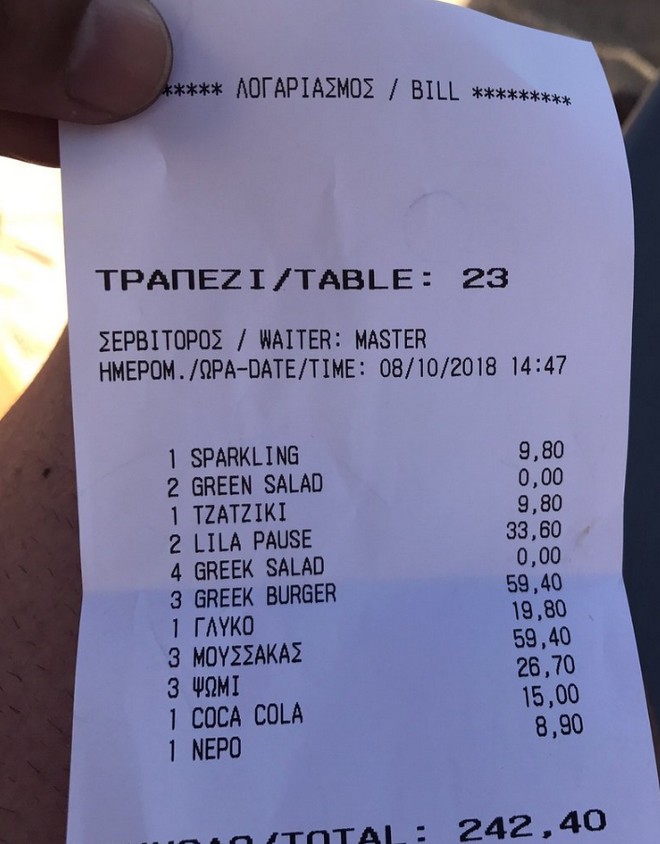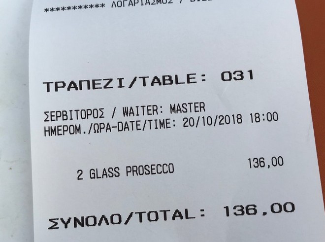 Ακολουθούν μια σειρά από αποδείξεις που φέρεται να έχει κόψει το εν λόγω εστιατόριο, όπως έχουν αναρτηθεί από πελάτες στο Trip Advisor: Όπως φαίνεται σε αυτές, ένα ποτήρι κρασί Prosecco κοστολογείται στα 68 ευρώ (αξίζει να σημειωθεί ότι δεν αναγράφεται αυτή η τιμή στο παραπάνω μενού), ο καφές freddo espresso και ο διπλός ελληνικός στα 10 ευρώ, η Coca Cola και η Sprite στα 15 και η μεγάλη μπύρα στα 20 ευρώ.