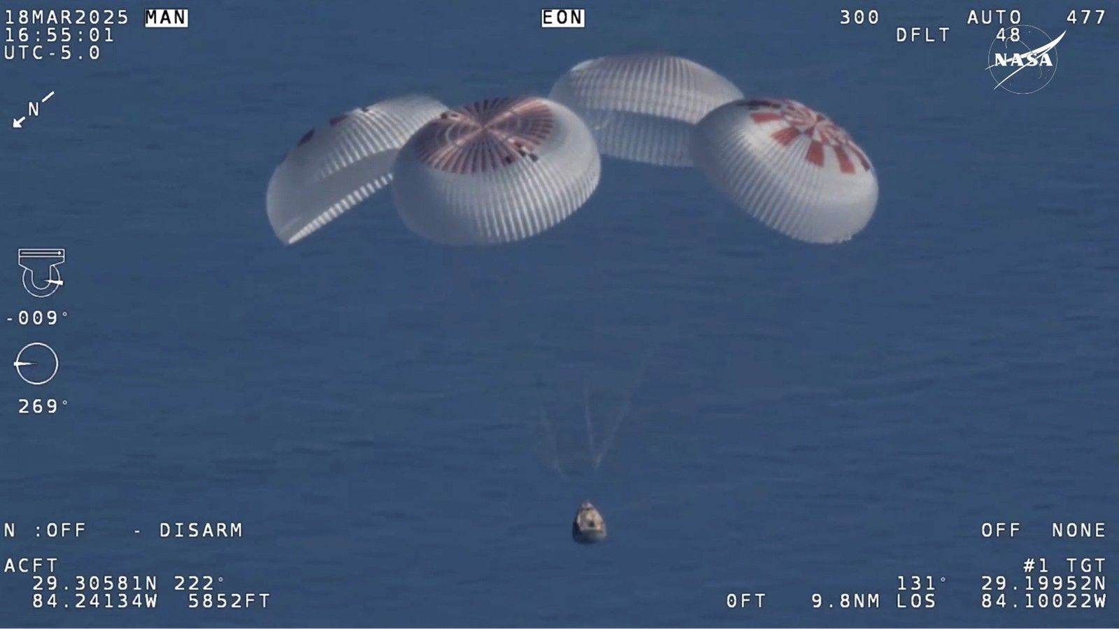 Τέσσερα αλεξίπτωτα επιβράδυναν την κάψουλα από την ταχύτητα των 27.359 χλμ./ώρα την οποία είχε πριν εισέλθει στην ατμόσφαιρα της Γης και μία φωνή από το κέντρο ελέγχου είπε: “Και… προσθαλάσσωση. Η ομάδα Crew-9 επέστρεψε στη Γη. Νικ, Αλεξάντρ, Μπουτς και Σούνη, εκ μέρους της SpaceX, καλώς ήρθατε σπίτι“, λίγο πριν εμφανιστεί μία ομάδα δελφινιών για να “επιθεωρήσει” το σκάφος που έπλεε.