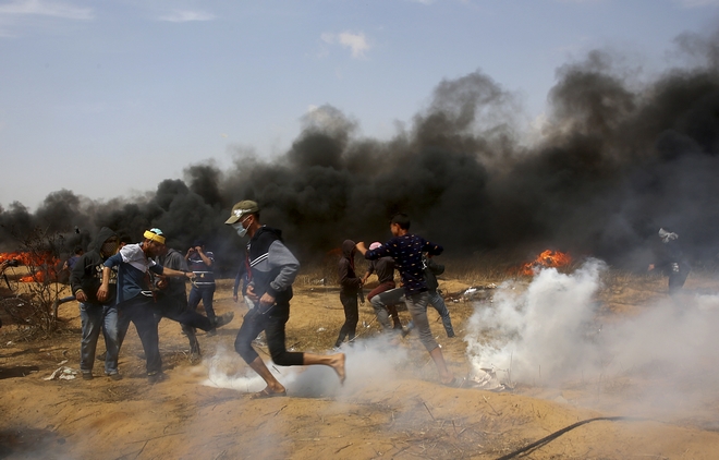 Παλαιστίνιοι διαδηλωτές τρέχουν για να καλυφθούν απ' τα δακρυγόνα, σε νέες βίαιες συγκρούσεις που ξέσπασαν στη Λωρίδα της Γάζας AP
