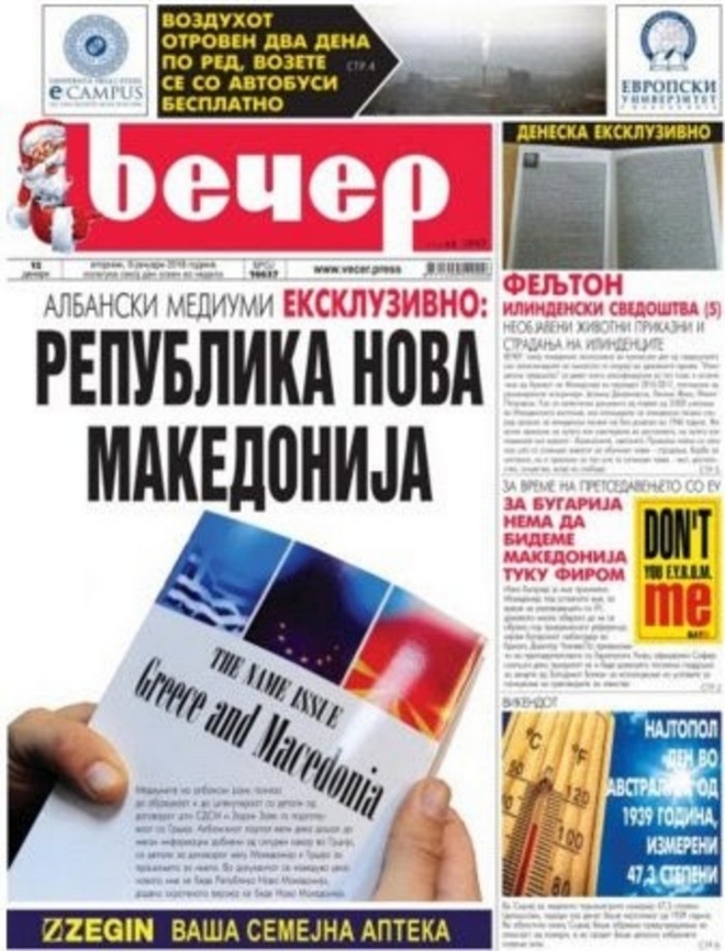 Στο ίδιο μήκος κύματος σε ό,τι αφορά στο όνομα κινείται και εφημερίδα των Σκοπίων η οποία επίσης κάνει λόγο για “Δημοκρατία της Νέας Μακεδονίας”.