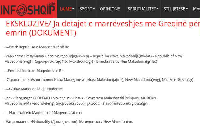 Σύμφωνα με το infoshqip, το όνομα της ΠΓΔΜ θα αναφέρεται στα σλαβικά, αγγλικά, ελληνικά και αλβανικά, ως εξής: