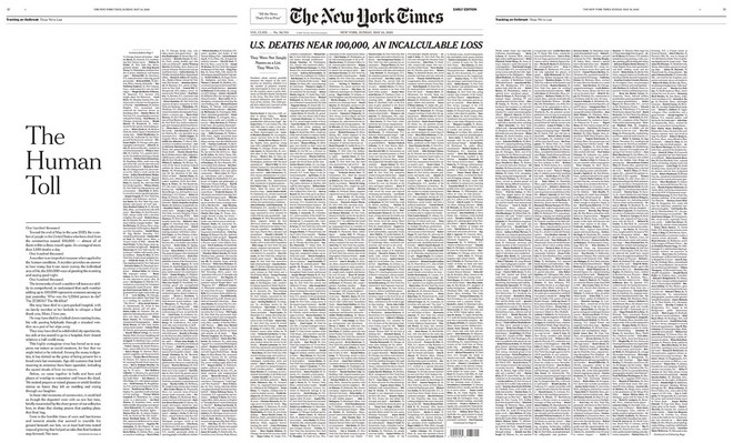 «Οι αριθμοί από μόνοι τους δεν μπορούν να μετρήσουν λογικά τον αντίκτυπο του κορονοϊού στις ΗΠΑ, είτε πρόκειται για τον αριθμό των ασθενών που ακολοθούν κάποια θεραπεία, τις εργασίες που έχουν διακοπεί ή τις ζωές που έχουν χαθεί. Καθώς η χώρα πλησιάζει το θλιβερό ορόσημο των 100.000 θανάτων που οφείλονται στον ιό, οι “New York Times” έκαναν τις νεκρολογίες θυμάτων. Οι 1.000 άνθρωποι παρακάτω αντιπροσωπεύουν μόλις το 1% του συνολικού αριθμού των θυμάτων. Κανένας δεν ήταν απλά ένας αριθμός».