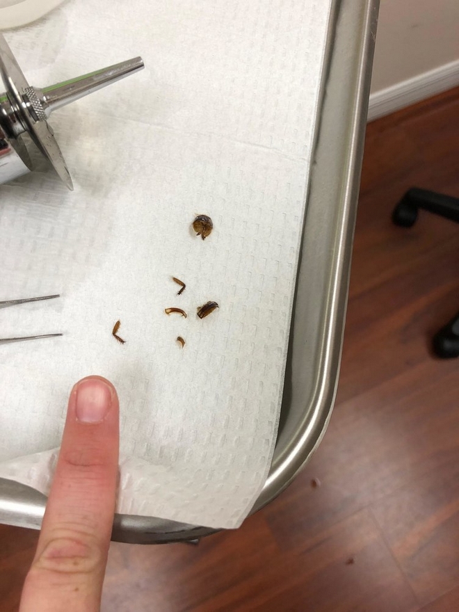 Εννέα μέρες αργότερα, η Χόλεϊ πήγε στον οικογενειακό γιατρό για επίσκεψη ρουτίνας και αυτός διαπίστωσε ότι “κάτι έχει μπλοκάρει” το αυτί της. Ήταν ένα ακόμα πόδι της κατσαρίδας και έξι κομμάτια του σώματός της, τα οποία αφαιρέθηκαν. Την ίδια μέρα η γυναίκα επισκέφτηκε ειδικό ωτορινολαρυγγολόγο, ο οποίος της είπε ότι υπάρχει ακόμα “κάτι εκεί”. Έβγαλε το κεφάλι και το πάνω μέρος του κορμού.