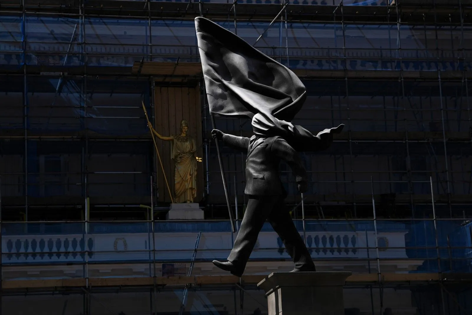 Το γλυπτό – το οποίο φέρει την υπογραφή του – απεικονίζει έναν άνδρα με κοστούμι να προχωρά μπροστά, κατεβαίνοντας από βάθρο, ενώ κρατά μια σημαία που καλύπτει το πρόσωπό του.