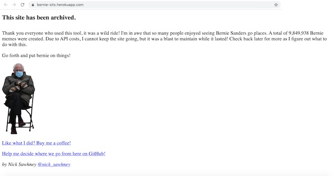 Η ορκωμοσία του Τζο Μπάιντεν – 46ου Προέδρου των ΗΠΑ, πλέον – ήταν γεμάτη στιγμές που προσφέρονταν για memes. Μια από αυτές ήταν ο Μπέρνι Σάντερς, καθισμένος σταυροπόδι σε πλιάν καρέκλα, φορώντας υπερμεγέθη γάντια από ανακυκλωμένα υλικά και ένα ζεστό μπουφάν. Με έμπνευση τη φωτογραφία που τράβηξε ο Brendan Smialowski, τα σχετικά memes άρχισαν να κατακλύζουν το Twitter καθώς η χαλαρή στάση του Μπέρνι σε συνδυασμό με το ότι καθόταν μόνος έκαναν τη φωτογραφία ακαταμάχητη. Επειδή πολλοί δεν έχουν την ικανότητα να δημιουργούν memes, ο Nick Sawhney, ο οποίος κάνει το μεταπτυχιακό του στο New York University, δημιούργησε έναν ιστότοπο που επιτρέπει στον οποιονδήποτε να «βάλει» τον Μπέρνι Σάντερς οπουδήποτε στον κόσμο με τη βοήθεια του Google Maps Street View.