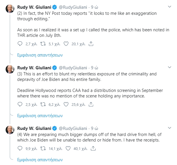 Ανακοίνωσε δε, πως ετοιμάζει αποκαλύψεις για τον Μπάιντεν και τους συνεργάτες του, τις οποίες όπως ισχυρίζεται ο Τζιουλιάνι, ο υποψήφιος των Δημοκρατικών δεν θα μπορούσε να διαψεύσει.