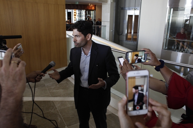 Orestes Fintiklis, manager of the Miami-based private equity fund Ithaca Capital, talks to the press in the lobby of the Trump Ocean Club International Hotel and Tower in Panama City, Monday, March 5, 2018. Escorted by police officers and a Panamanian judicial official, the owner of the Trump Panama City hotel has taken control of the property. A team of Trump security officials left the property. (AP Photo/Arnulfo Franco) APimages