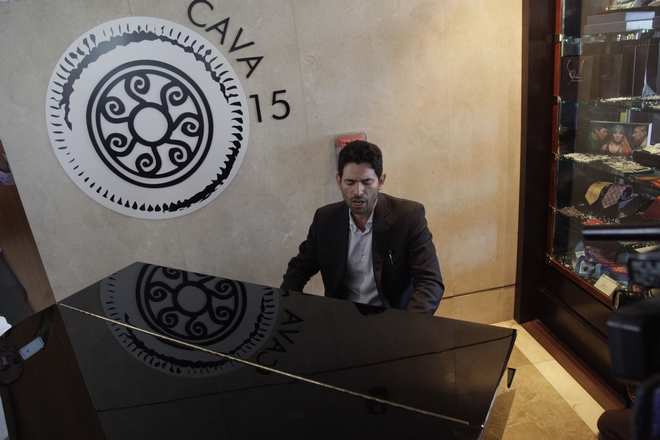 Orestes Fintiklis, manager of the Miami-based private equity fund Ithaca Capital, plays a piano at the lobby of the Trump Ocean Club International Hotel and Tower in Panama City, Monday, March 5, 2018. Escorted by police officers and a Panamanian judicial official, the owner of the Trump Panama City hotel has taken control of the property. A team of Trump security officials left the property. (AP Photo/Arnulfo Franco) APimages