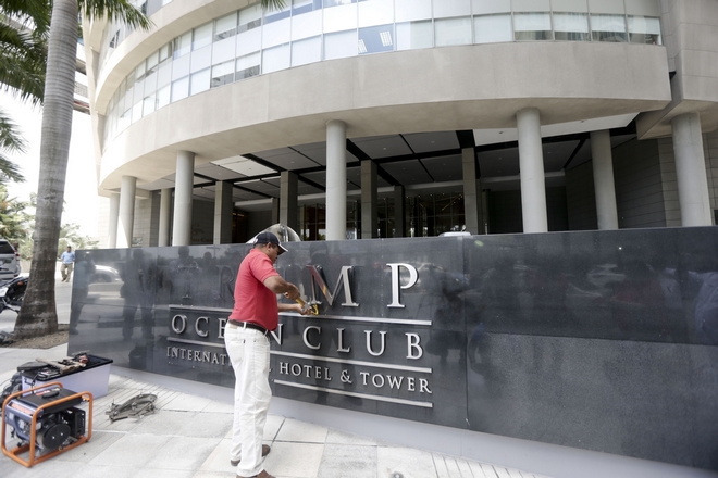 A man removes the word Trump, off a marquee outside the Trump Ocean Club International Hotel and Tower in Panama City, Monday, March 5, 2018. Escorted by police officers and a Panamanian judicial official, the owner of the Trump Panama City hotel has taken control of the property. A team of Trump security officials left the property. (AP Photo/Arnulfo Franco) APimages