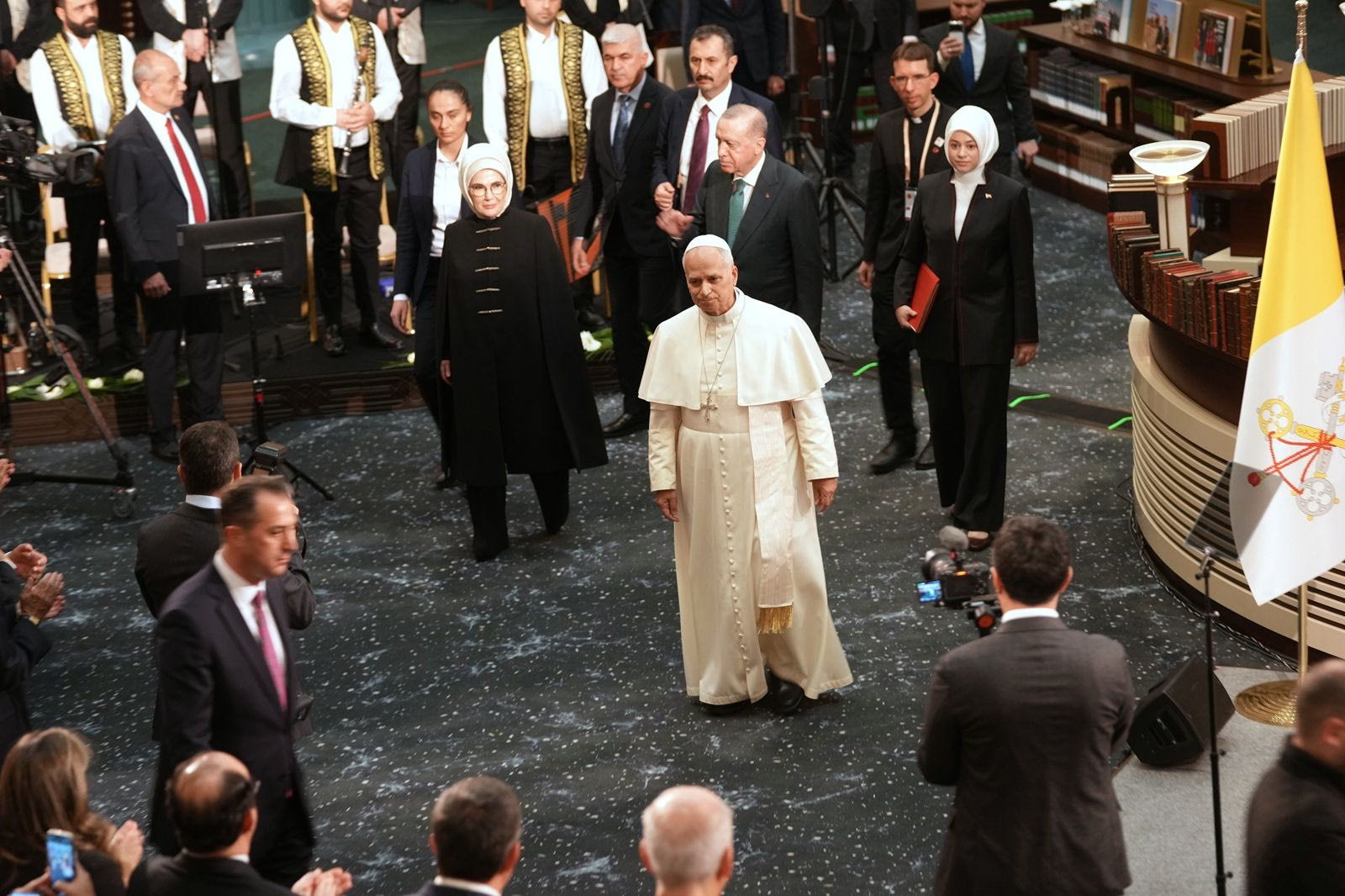 Ο Τούρκος πρόεδρος Ρετζέπ Ταγίπ Ερντογάν υποδέχθηκε την Πέμπτη (27/11) τον επικεφαλής του Κράτους του Βατικανού και της Καθολικής Εκκλησίας, Πάπα Λέοντα ΙΔ΄, στο Προεδρικό Μέγαρο στην Άγκυρα.