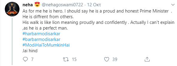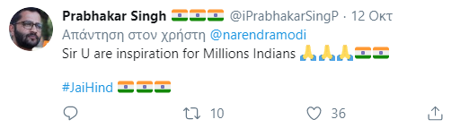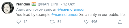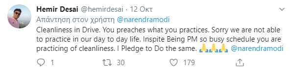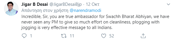 «Περπατώντας σε μια παραλία στο Μαμαλαπουράμ σήμερα το πρωί. Διήρκεσε πάνω από 30 λεπτά» ανέφερε στην ανάρτησή του. «Ας εξασφαλίσουμε ότι οι δημόσιοι χώροι μας είναι καθαροί και τακτοποιημένοι» Αναφερόμενος στην άσκηση και την υγεία τονίζει: «Και ας εξασφαλίσουμε πως παραμένουμε σε φόρμα και υγιείς».