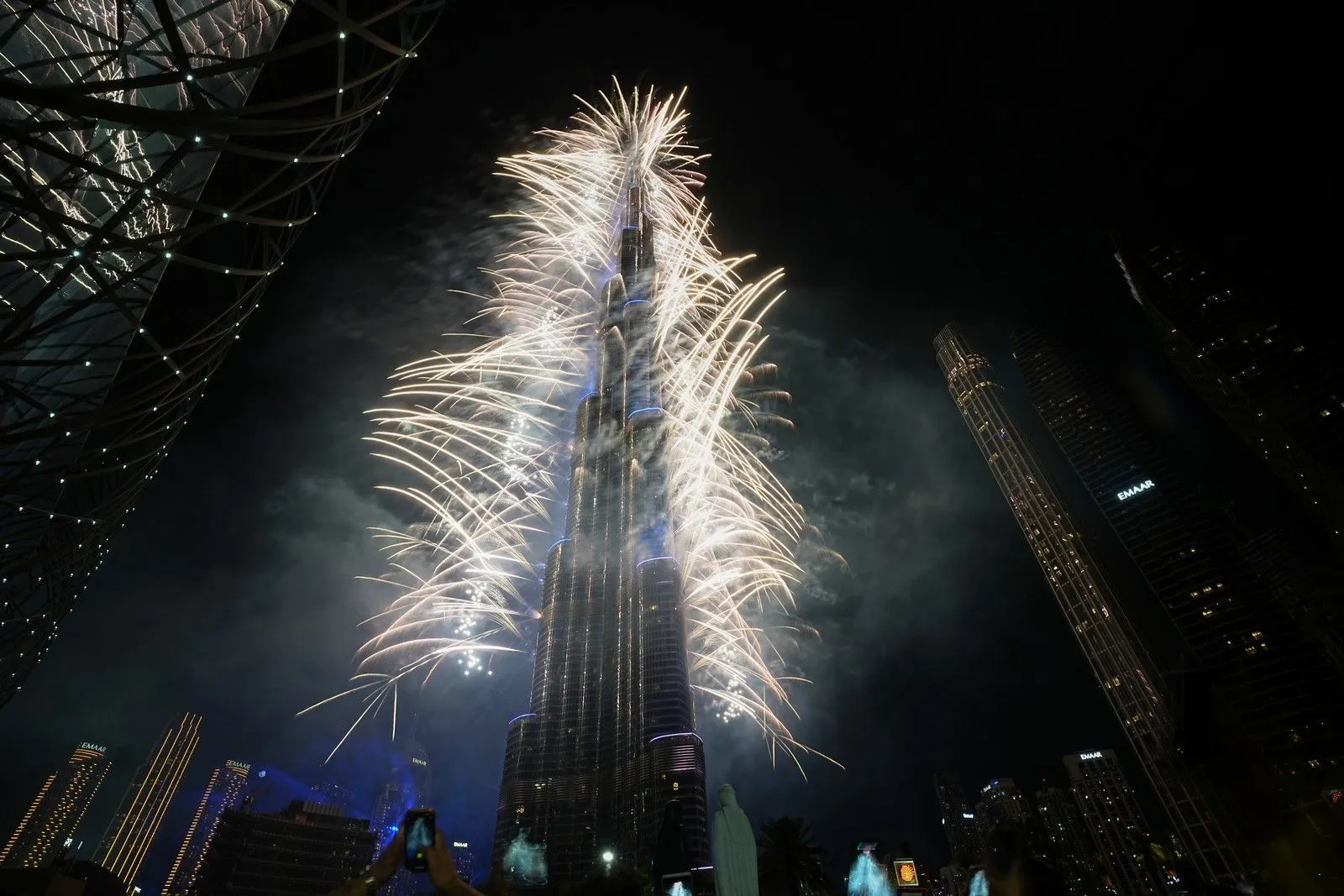 Fireworks explode around the Burj Khalifa, the world's tallest building, during New Year's Eve celebrations in Dubai, United Arab Emirates, Thursday, Jan. 1, 2026. (AP Photo/Fatima Shbair)