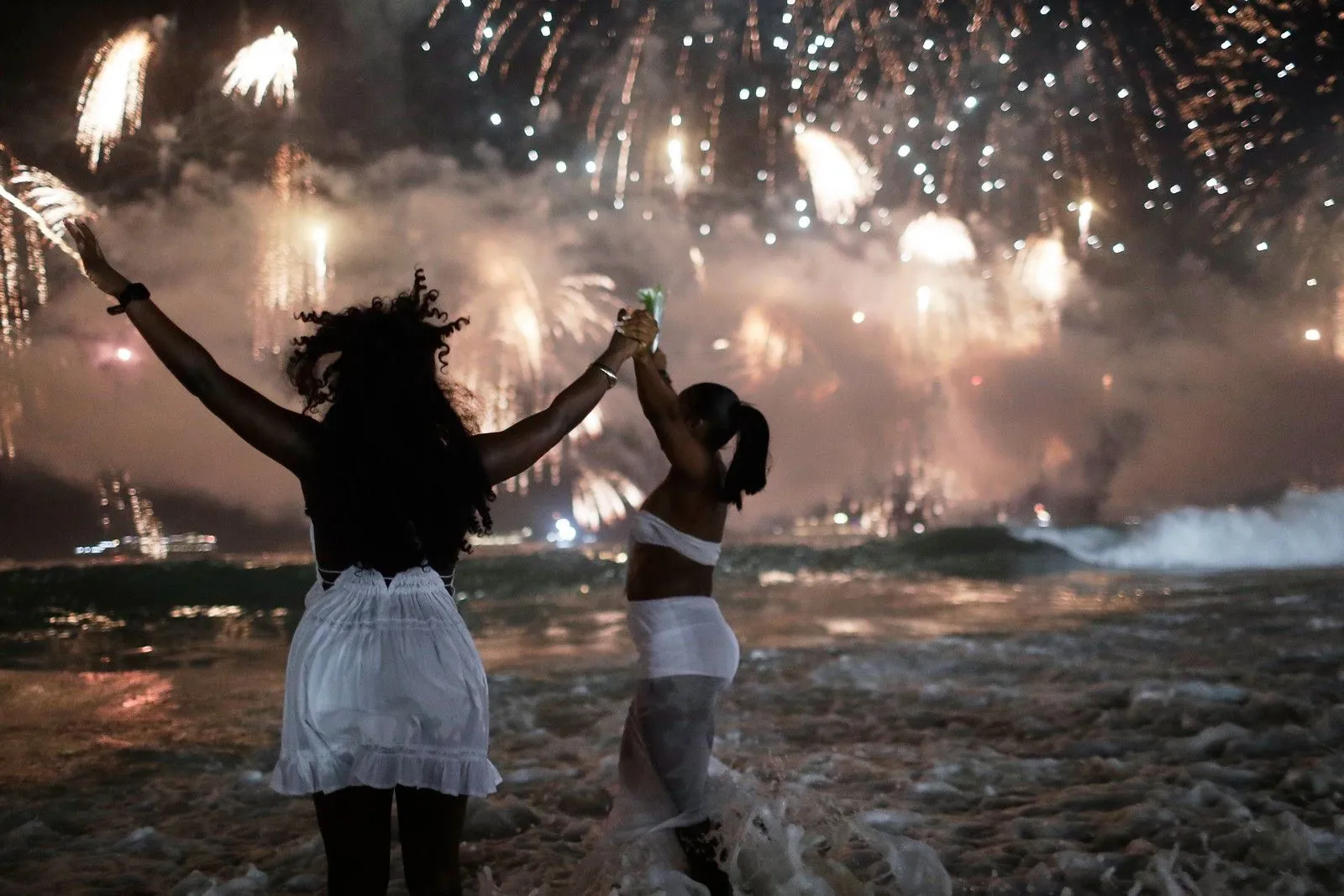 People celebrate as fireworks light up the sky over Copacabana Beach during New Year's celebrations in Rio de Janeiro, Thursday, Jan. 1, 2026. (AP Photo/Bruna Prado)
