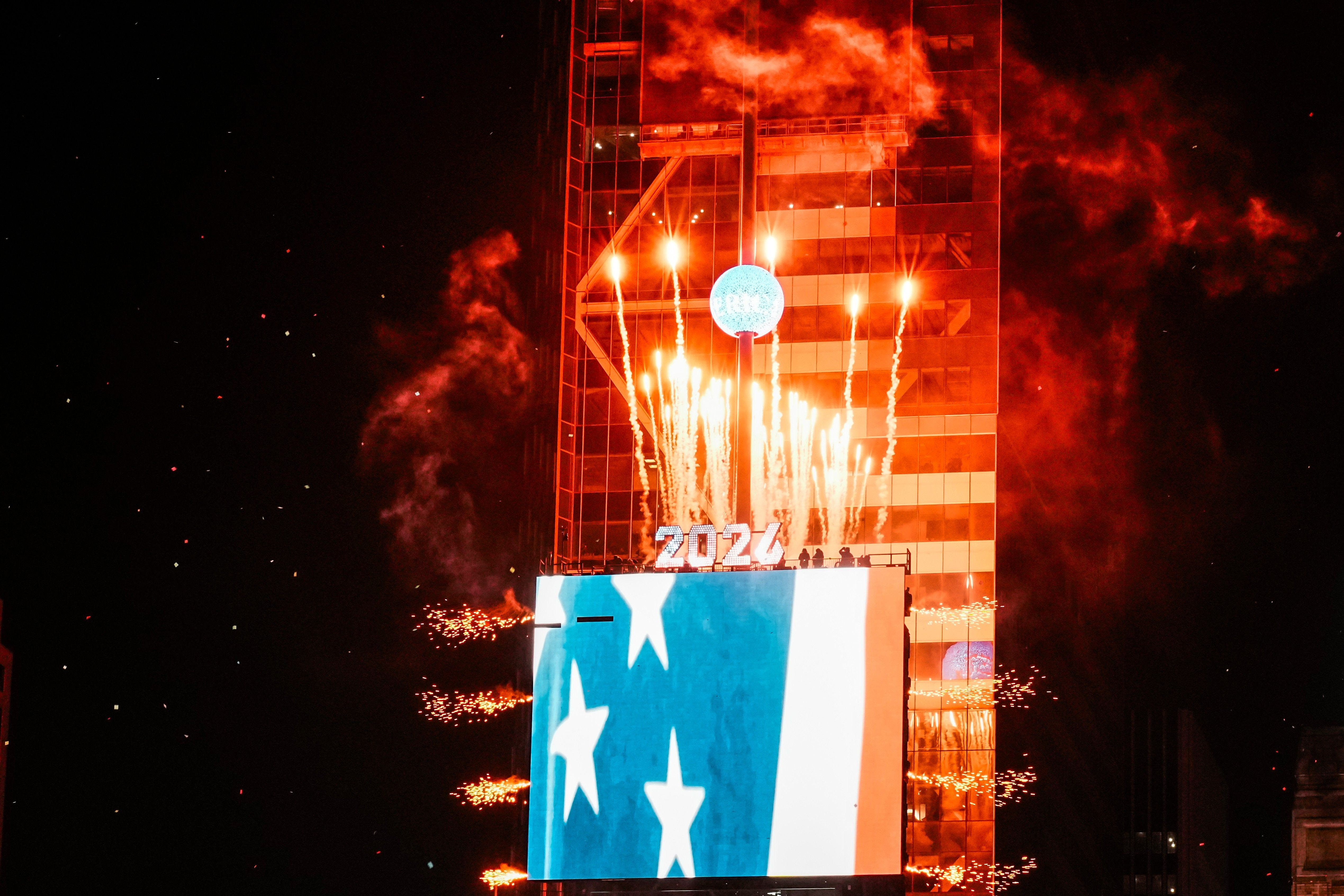Fireworks are displayed on top of One Times Square during New Year's Eve celebration, Thursday, Jan. 1, 2026, in New York. (AP Photo/Eduardo Munoz Alvarez)