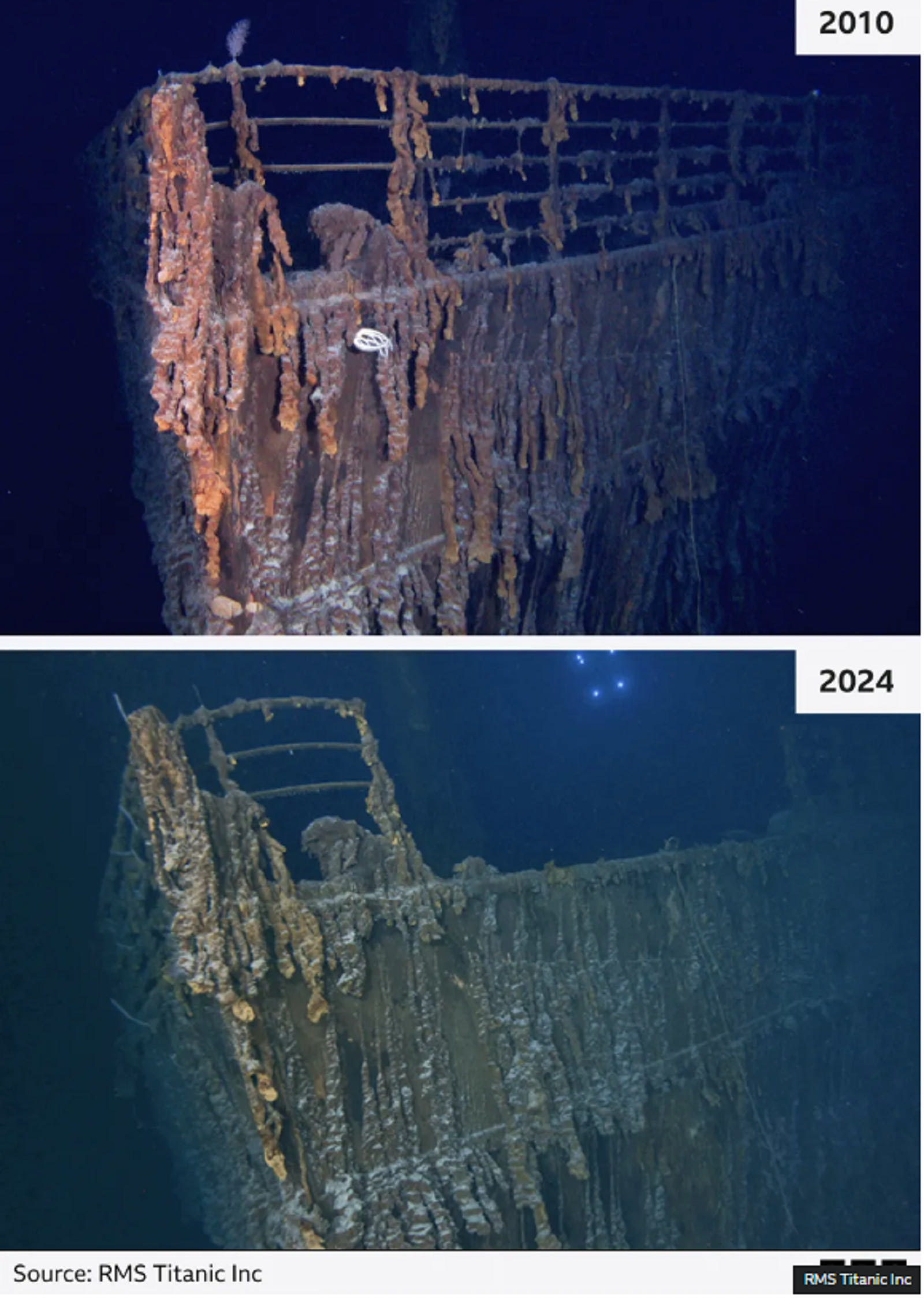 «Κάποια στιγμή το μέταλλο υποχώρησε και έπεσε», ανέφερε η Τόμασινα Ρέι. Δεν είναι το μόνο μέρος του πλοίου, που βρίσκεται σε βάθος 3.800 μέτρων, που χάνεται στη θάλασσα. Η μεταλλική κατασκευή καταστρέφεται από μικροοργανισμούς, δημιουργώντας σταλακτίτες από σκουριά που ονομάζονται “rusticles”.