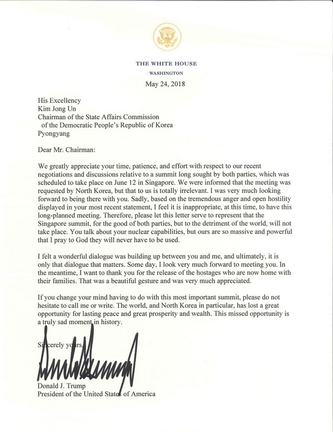 Ο Λευκός Οίκος έδωσε στη δημοσιότητα επιστολή του Αμερικανού προέδρου Ντόναλντ Τραμπ προς τον ηγέτη της Βόρειας Κορέας Κιμ Γιονγκ Ουν, στην οποία γίνεται γνωστό από τον Τραμπ ότι η πολυαναμενόμενη Σύνοδος της Σιγκαπούρης δεν θα διεξαχθεί.