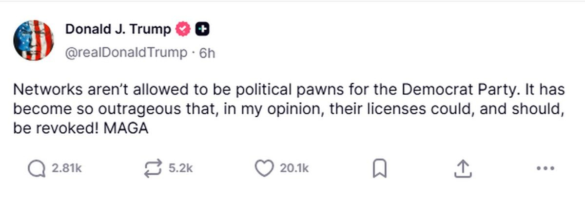 Όπως ισχυρίστηκε, χωρίς να παραθέτει στοιχεία, σε ανάρτησή του στην πλατφόρμα Truth Social, οι παραπάνω “παραβίασαν τον νόμο“. Συγκεκριμένα μάλιστα για τα ειδησεογραφικά δίκτυα, “οι άδειες τους θα μπορούσαν και θα έπρεπε να ανακληθούν”.
