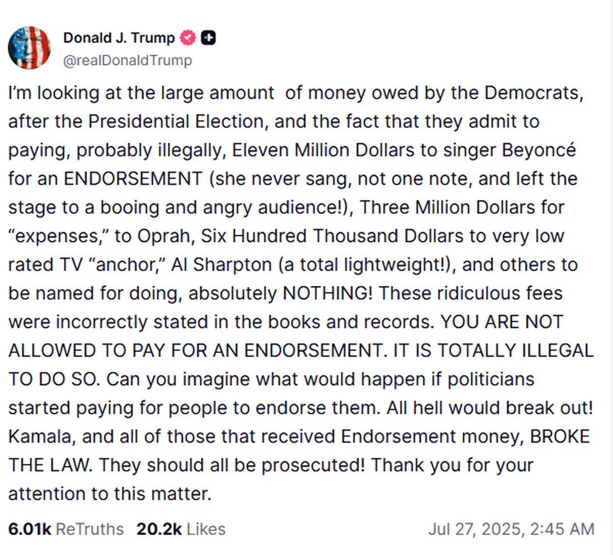 Αφορμή για τις νέες απειλές Τραμπ στάθηκε, όπως γράφει ο ίδιος, το μεγάλο χρηματικό ποσό που οφείλουν οι Δημοκρατικοί μετά τις προεδρικές εκλογές, καθώς όπως ισχυρίστηκε, η τραγουδίστρια Μπιγιονσέ πληρώθηκε 11 εκατομμύρια δολάρια για να στηρίξει την Χάρις, ενώ 3 εκατομμύρια δολάρια δαπανήθηκαν για “έξοδα” στην διάσημη παρουσιάστρια και 600.000 δολάρια στον ακτιβιστή των πολιτικών δικαιωμάτων και παρουσιαστή της τηλεόρασης Ρεβέντ Αλ Σάρπτον