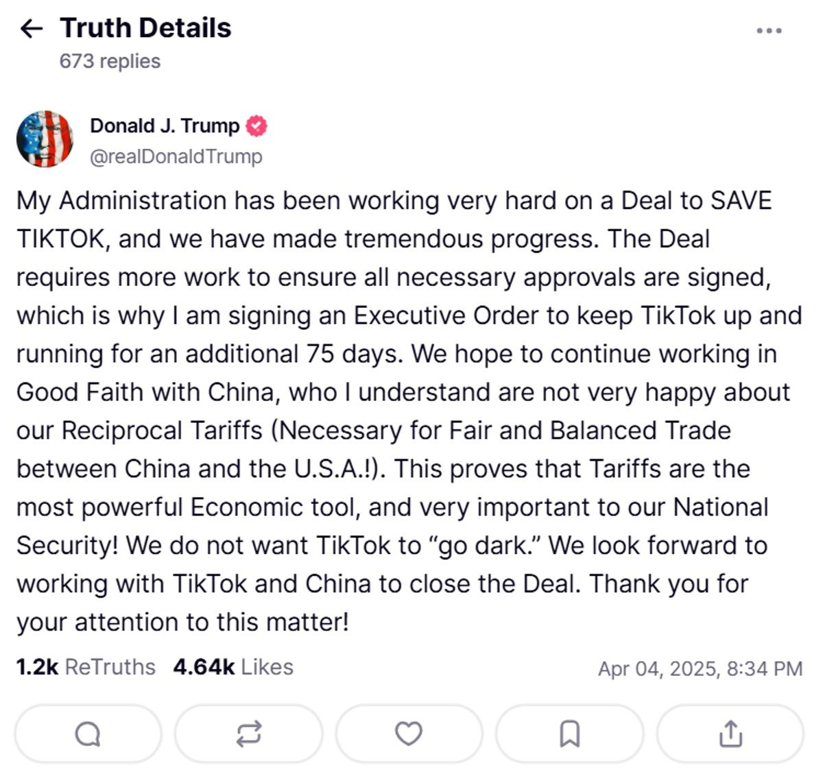 Η παράταση της προθεσμίας ανακοινώθηκε από τον Τραμπ μέσω της πλατφόρμας Truth Social, με τον ίδιο να δηλώνει ότι η συμφωνία για το TikTok “χρειάζεται επιπλέον δουλειά για να εξασφαλιστεί ότι όλες οι απαραίτητες εγκρίσεις θα υπογραφούν”. Η νέα παράταση “θα επιτρέψει στο TikTok να συνεχίσει να λειτουργεί για άλλες 75 ημέρες”, έγραψε μεταξύ άλλων ο Τραμπ. Η νέα προθεσμία μεταφέρει τη διορία για την πώληση του TikTok στα μέσα Ιουνίου.