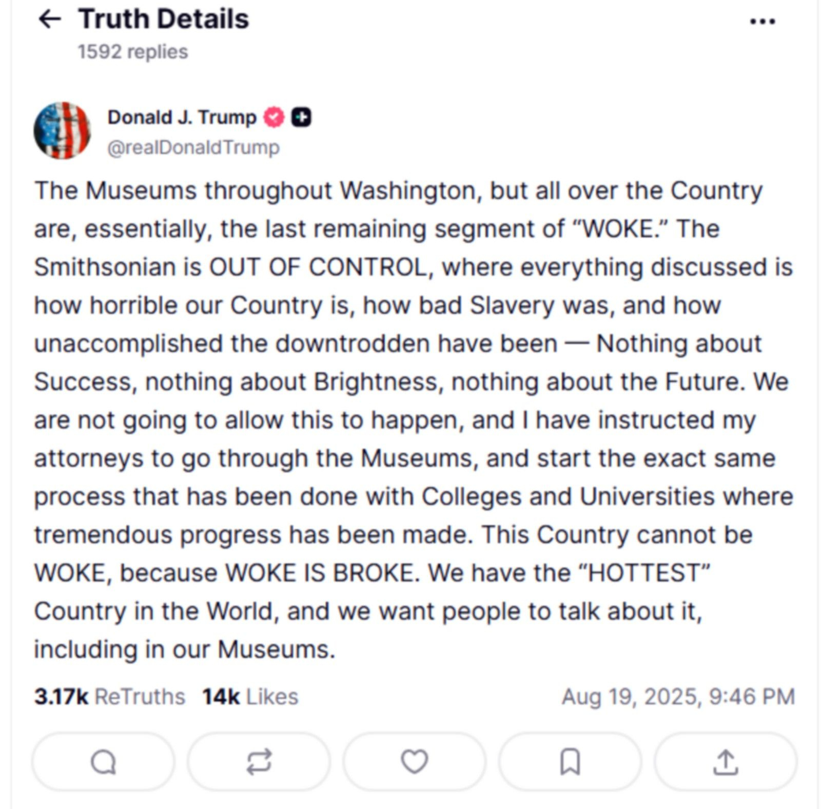 “Τα Μουσεία σε όλη την Ουάσινγκτον, αλλά και σε όλη τη Χώρα, είναι ουσιαστικά το τελευταίο τμήμα του «WOKE». Το Σμιθσόνιαν έχει ΧΑΣΕΙ ΤΟΝ ΕΛΕΓΧΟ, όπου το μόνο που συζητούν είναι το πόσο φρικτό είναι το έθνος μας, πόσο κακή ήταν η δουλεία και πόσο ανειδίκευτοι υπήρξαν οι καταπιεσμένοι — τίποτα για την Επιτυχία, τίποτα για τη Φωτεινότητα, τίποτα για το Μέλλον. Δεν θα επιτρέψουμε να συμβεί αυτό, και έχω δώσει εντολή στους δικηγόρους μου να περάσουν από τα Μουσεία και να ακολουθήσουν την ίδια διαδικασία που ακολουθήθηκε με τα Κολλέγια και τα Πανεπιστήμια, όπου σημειώθηκε τεράστια πρόοδος. Αυτή η Χώρα δεν μπορεί να είναι WOKE, γιατί το WOKE ΕΙΝΑΙ ΑΠΟΤΥΧΗΜΕΝΟ. Έχουμε τη «ΠΙΟ ΖΕΣΤΗ» Χώρα στον Κόσμο και θέλουμε ο κόσμος να μιλάει γι’ αυτήν, και στα Μουσεία μας”.