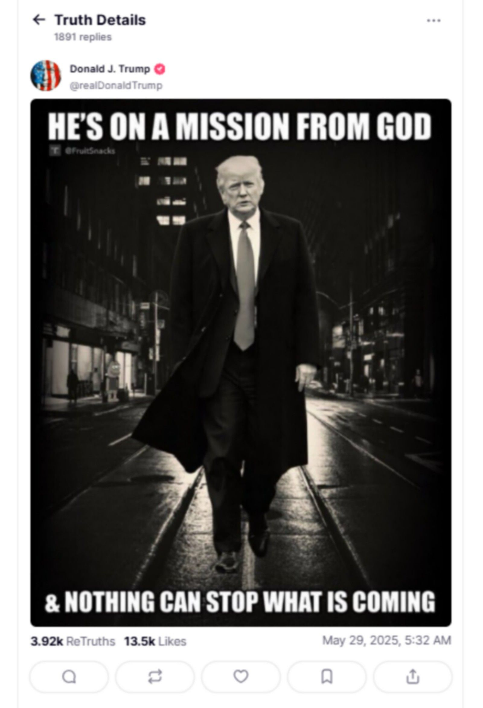 Ειδικότερα, στην πρώτη ανάρτησή του, ο Τραμπ δημοσίευσε μια φωτογραφία στην οποία απεικονίζεται ο ίδιος περπατάει μόνος του σε έναν σκοτεινό δρόμο. Στην εικόνα αναγράφεται η φράση “Είναι σε αποστολή από τον Θεό. Και τίποτα δεν μπορεί να σταματήσει αυτό που έρχεται”, σε τρίτο, δηλαδή, πρόσωπο.