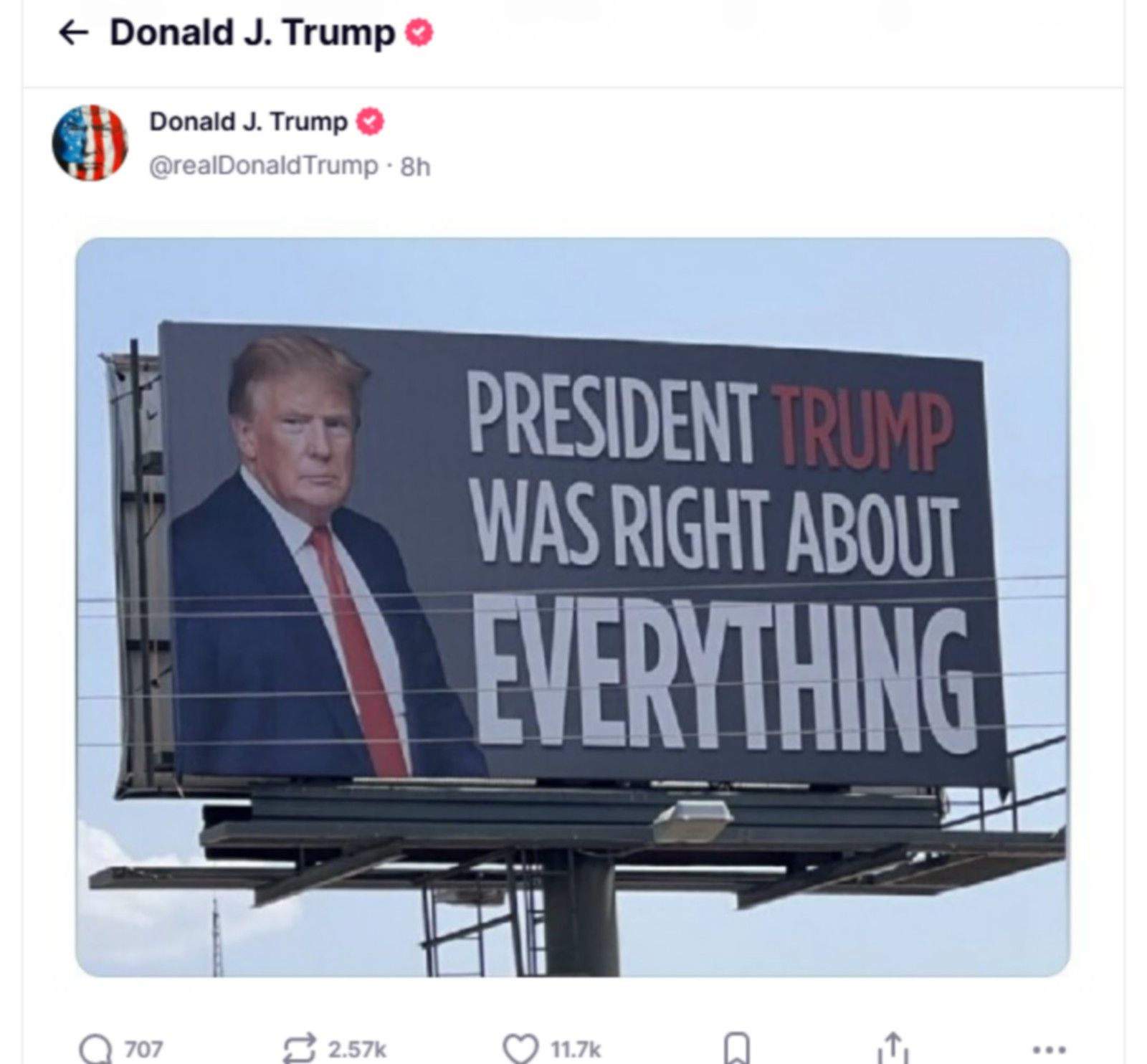 Στη δεύτερη ανάρτησή του, δημοσίευσε, επίσης, μια εικόνα στην οποία υπάρχει μια μεγάλη πινακίδα, όπως αυτές που συναντά κανείς συχνά σε μεγαλουπόλεις των ΗΠΑ, με τη φράση “Ο πρόεδρος Τραμπ είχε δίκιο σε όλα”, πάλι σε τρίτο πρόσωπο.