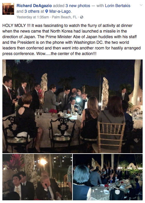 “Θεέ μου! Ήταν εντυπωσιακό να παρακολουθείς τη δραστηριότητα στο δείπνο καθώς έρχονταν οι ειδήσεις για τη Βόρεια Κορέα” αναγράφει ο πολίτης στο facebook πάνω από τις φωτογραφίες. Όπως σημειώνει η WP, άλλοι παρευρισκόμενοι στο θέρετρο έσπευσαν να σχολιάσουν κάτω από την ανάρτηση.