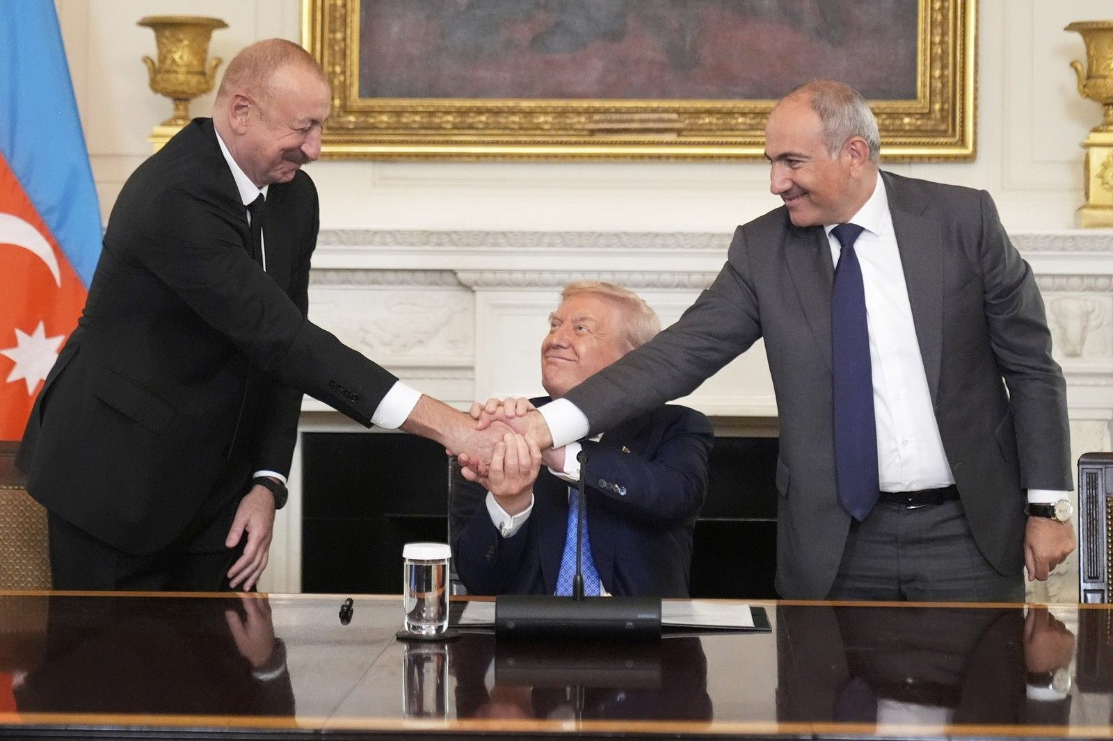 Ο Πρόεδρος Ντόναλντ Τραμπ με τον Πρωθυπουργό της Αρμενίας Νικολ Πασινιάν και τον Πρόεδρο του Αζερμπαϊτζάν Ιλχάμ Αλίεφ 2025 Mark Schiefelbein/AP Photo