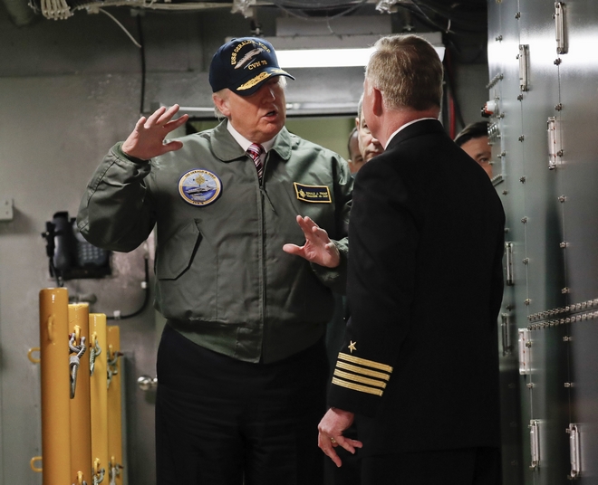President Donald Trump talks with Capt. Richard "Rick" McCormack during a tour of the nuclear aircraft carrier Gerald R. Ford, Thursday, March 2, 2017, at Newport News Shipbuilding in Newport News, Va. Trump traveled to Virginia to meet with sailors and shipbuilders on aircraft carrier which is scheduled to be commissioned this year after cost overruns and delays. (AP Photo/Pablo Martinez Monsivais) AP