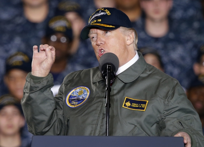 Φορώντας ένα στρατιωτικό μπουφάν του αμερικανικού πολεμικού ναυτικού και ένα μπλε καπέλο του μπέιζμπολ, ο Ντόναλντ Τραμπ επισκέφτηκε την Παρασκευή μια ναυτική βάση και δεσμεύτηκε ότι θα αυξήσει τις στρατιωτικές δαπάνες και θα προχωρήσει στη μεγαλύτερη ναυπήγηση πολεμικών πλοίων μετά το τέλος του Ψυχρού Πολέμου.
