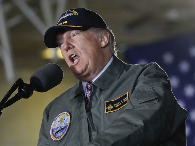 President Donald Trump speaks while aboard the nuclear aircraft carrier Gerald R. Ford, Thursday, March 2, 2017, at Newport News Shipbuilding in Newport, Va. Trump traveled to Virginia to meet with sailors and shipbuilders on aircraft carrier which is scheduled to be commissioned this year after cost overruns and delays. (AP Photo/Pablo Martinez Monsivais) AP