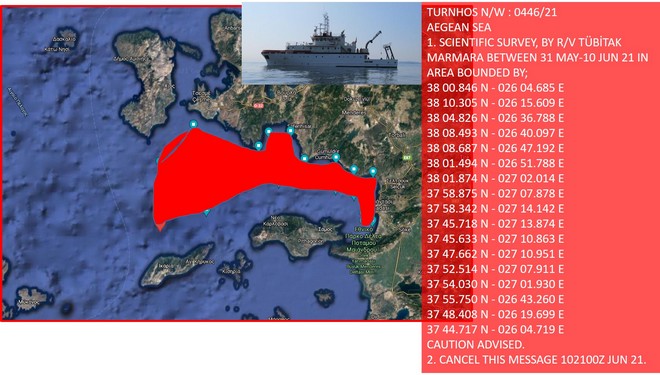 Συγκεκριμένα, η Τουρκία θα βγάλει ερευνητικό σκάφος σε περιοχή του Αιγαίου μεταξύ Χίου – Σάμου, με τη σχετική NAVTEX να έχει ισχύ από 31 Μαΐου.