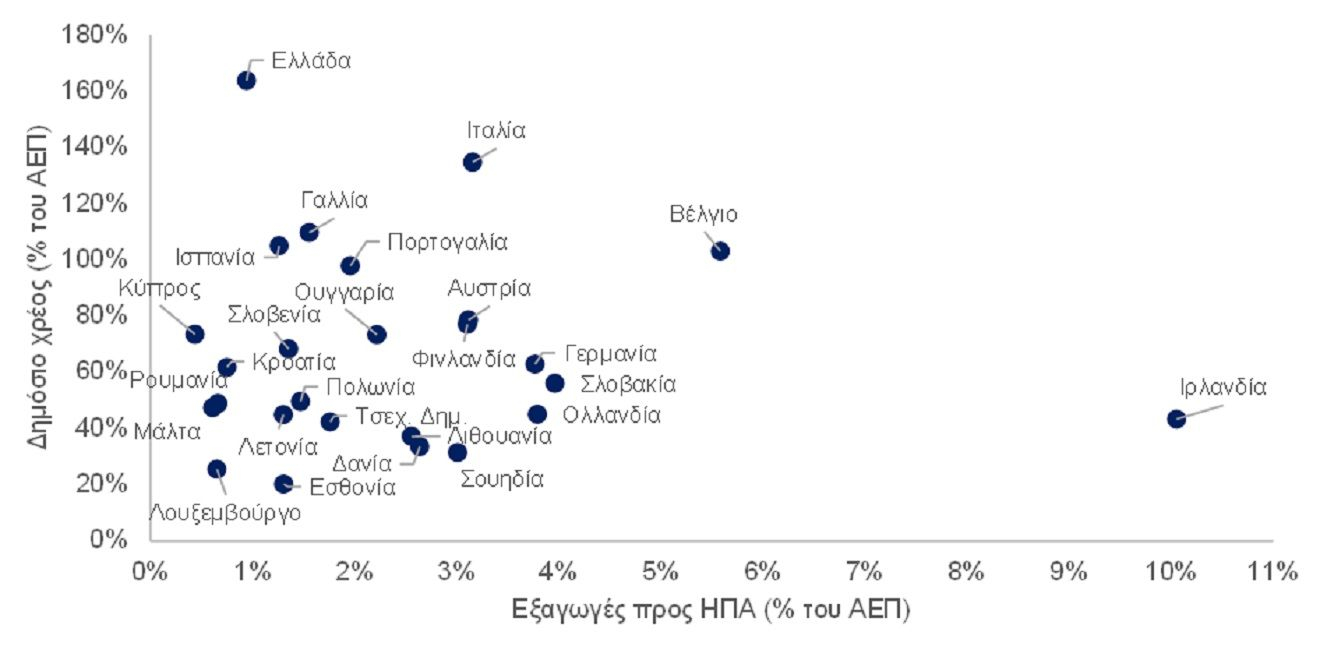 Όπως δείχνει το Γράφημα 1, για πολλές χώρες, οι εξαγωγές στις ΗΠΑ αντιπροσωπεύουν ένα σημαντικό μερίδιο του ΑΕΠ. Ταυτόχρονα, το μερίδιο των ΗΠΑ στις συνολικές εξαγωγές της ΕΕ είναι κάτω του 8%.