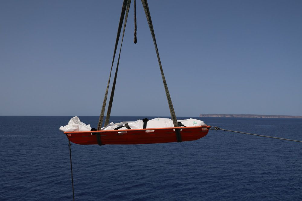 Στις 8 Ιουνίου 2024, μετά από οδηγίες των ιταλικών αρχών, οι 11 σοροί που είχαν ανασυρθεί από τη Μεσόγειο Θάλασσα την προηγούμενη ημέρα, μεταφέρθηκαν από την ομάδα του Geo Barents σε σκάφος της ιταλικής ακτοφυλακής κοντά στη Λαμπεντούζα. Ιούνιος 2024-Μεσόγειος Θάλασσα. Frederic Seguin/MSF