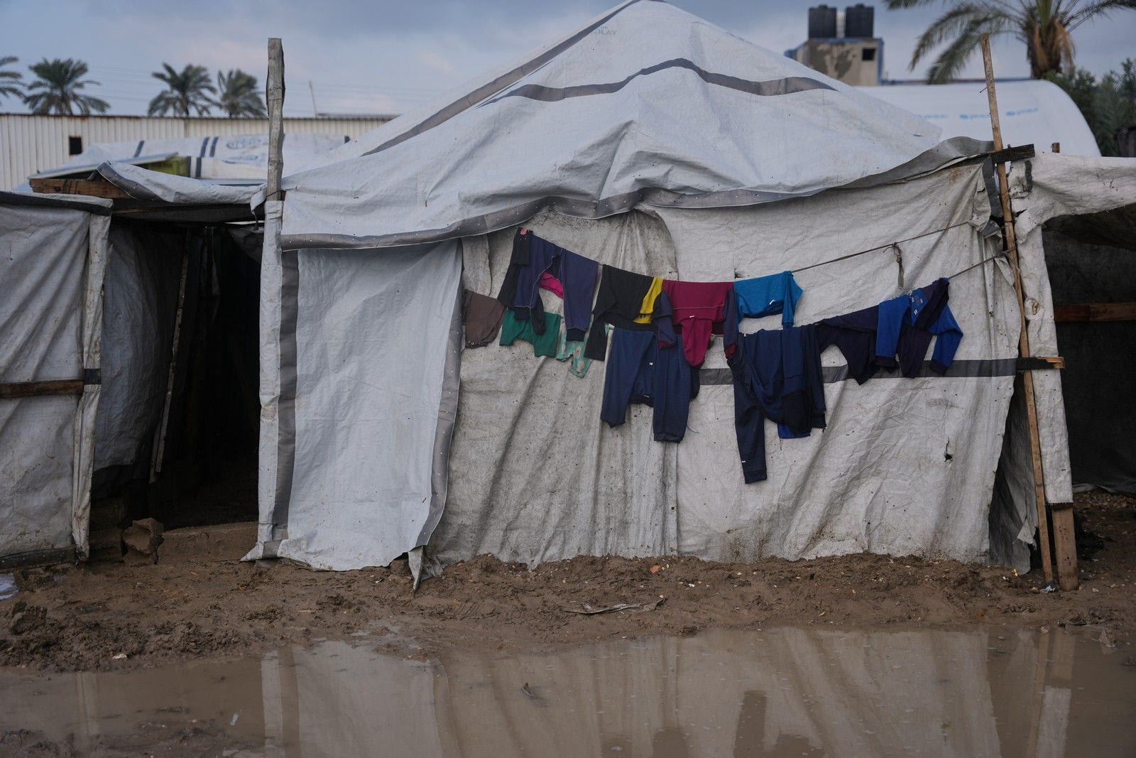 Ρούχα κρέμονται στην είσοδο μιας σκηνής δίπλα σε μια πλημμυρισμένη περιοχή σε προσωρινό καταυλισμό για εκτοπισμένους Παλαιστίνιους μετά από έντονες βροχοπτώσεις στο Ντέιρ αλ-Μπάλαχ, στην κεντρική Λωρίδα της Γάζας, την Παρασκευή 12 Δεκεμβρίου 2025