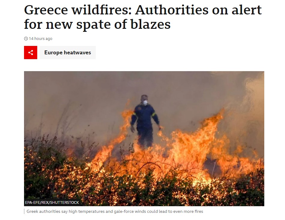 Το BBC κάνει λόγο για την κατάσταση συναγερμού που βρίσκονται πολλά μέρη της Ελλάδας, εξαιτίας των ισχυρών ανέμων και των υψηλών θερμοκρασιών.