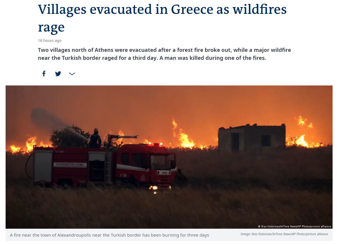 Στην πραγματοποίηση εκκενώσεων αναφέρθηκε και η DW στα χωριά της Βοιωτίας κάνοντας αναφορές και για τους ισχυρούς ανέμους στην Αλεξανδρούπολη, οι οποίοι δυσχεραίνουν το έργο της πυροσβεστικής.