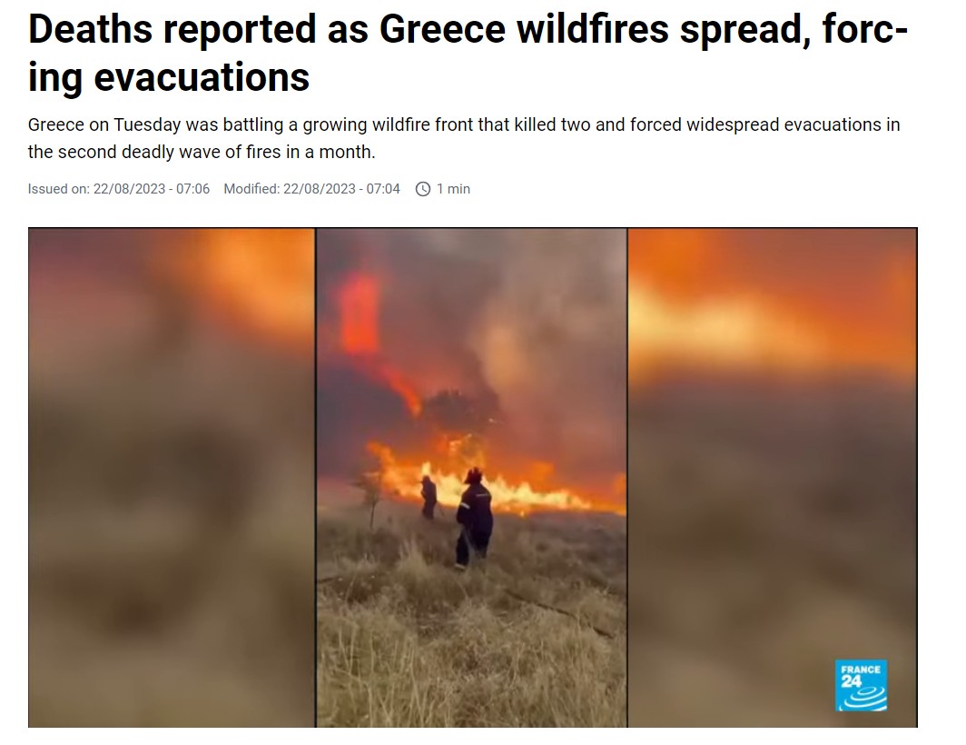 Για τους θανάτους δύο ανθρώπων εξαιτίας των πυρκαγιών έγραψε το France24, ενώ αναφέρθηκε και για το πύρινο μέτωπο στην Εύβοια. Σημείωσε, ακόμη και για το πόσο σημαντικός βιότοπος είναι η Δαδιά στης Αλεξανδρούπολη, η οποία τυλίχθηκε στις φλόγες.