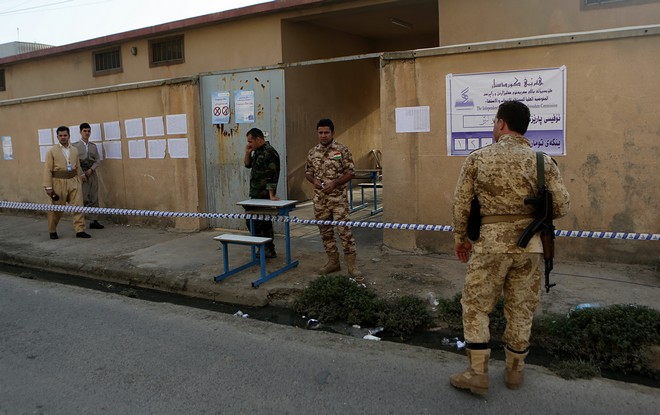Kurdish security services stand guard outside polling center shortly before opening for the referendum on independence from Iraq in Irbil, Iraq, Monday, Sept. 25, 2017. (AP Photo/Khalid Mohammed) AP