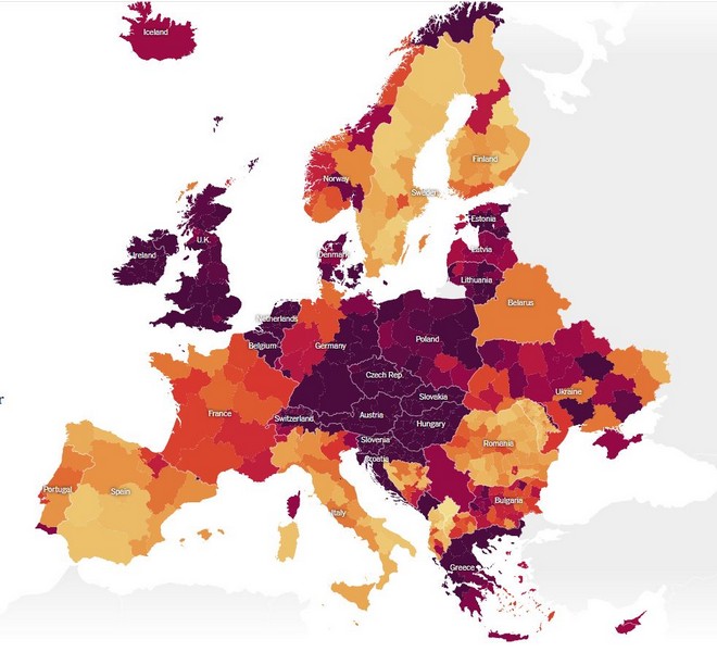 Σε ποια κατηγορία ανήκει η χώρα μας; Με τη νησιωτική Ελλάδα να βρίσκεται κυρίως στο πορτοκαλί (εξαιρουμένης της Κρήτης), η υπόλοιπη χώρα ανήκει στο κόκκινο, το οποίο γίνεται όλο και πιο βαθύ στα βόρεια.